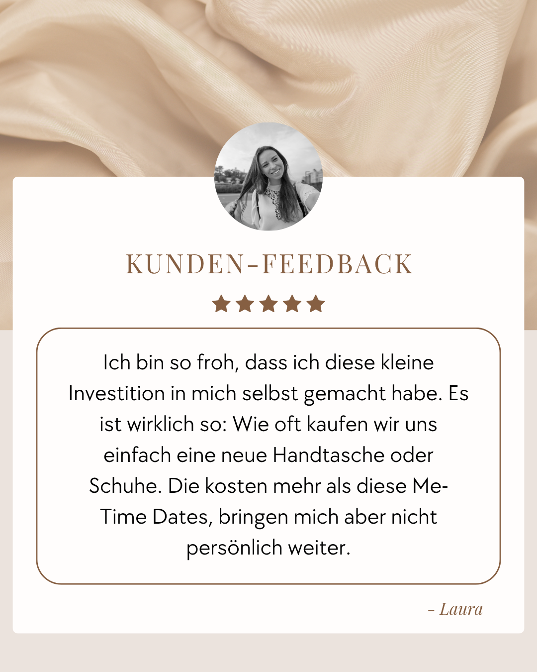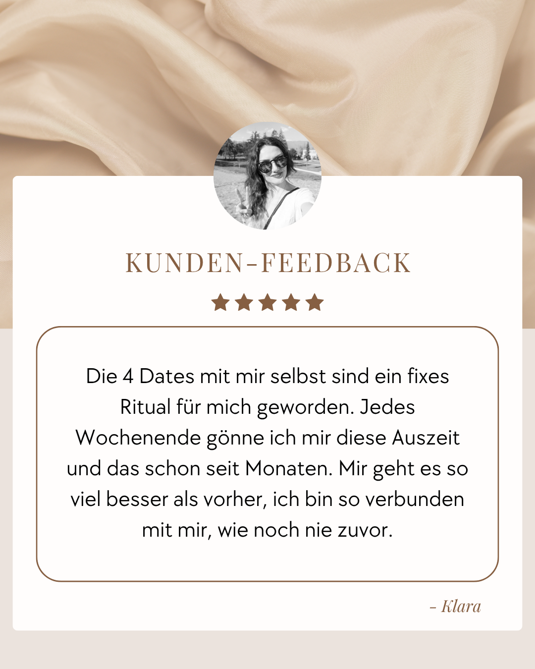 • BONUS: zusätzlich erhältst du Übungen, die du zwischen deinen Dates mit dir selbst einbauen kannst, um mehr Achtsamkeit und Gelassenheit im Alltag zu integrieren.